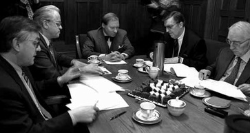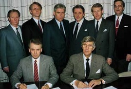Þann 14. mars 1997 var undirritaður samningur um kauprétt og kaup á eignarhluta í áföngum á hlutabréfum Brunabótafélags Íslands í VÍS.Myndin sýnir er bankastjórarnir Halldór Guðbjarnarson og Sverrir Hermannsson, Kjartan Gunnarsson, formaður bankaráðs, Hilmar Pálsson, forstjóri Eignarhaldsfélags Brunabótafélags Íslands, og Björgvin Vilmundarson bankastjóri undirrita samninginn. |
