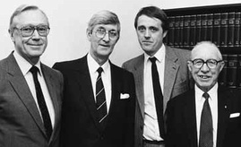 Mynd tekin 13. febrúrar 1985 þegar tilkynnt var um stofnun BÍ-líftryggingar gt.F.v.: Tore Melgård, í stjórn líftryggingafélags Storebrands, Ingi R. Helgason, forstjóri, Jostein Sörvoll, aðstoðarforstjóri líftryggingafélags Storebrand og Stefán Reykjalín stjórnarformaður. |